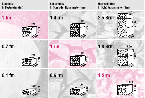 Bei Brennholz ist eines der wichtigsten Kriterien um festzustellen, was man wirklich bekommt, die Art der Angabe über die Menge. Dies kann, wie in folgender Tabelle aufgeführt, in mehreren Möglichkeiten stattfinden.